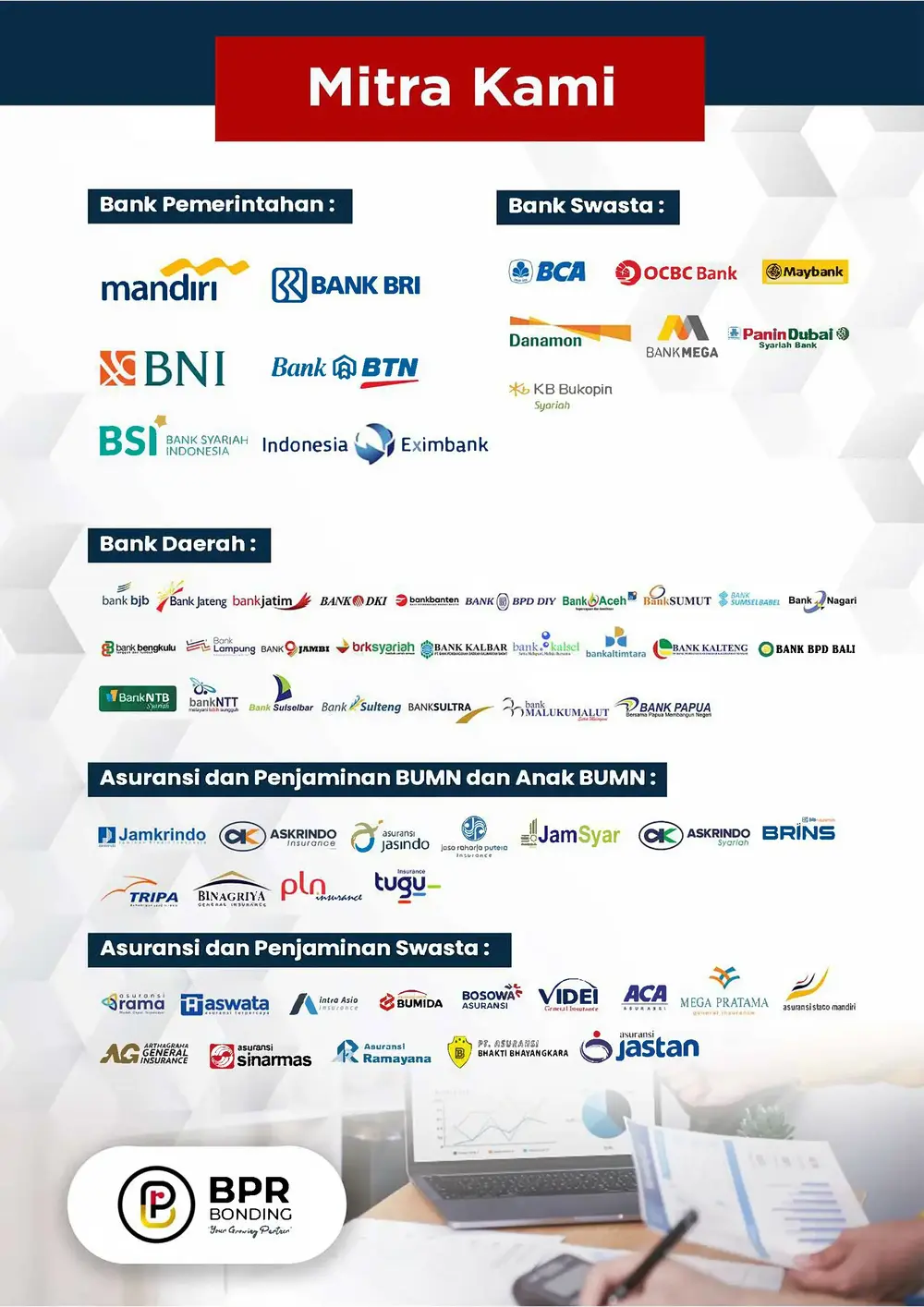 BPR Bonding adalah perusahaan yang dapat didefinisikan secara umum memiliki peran sebagai penghubung atau perantara bagi Perusahaan Penyedia Barang atau Jasa, Penerima Jaminan dan Lembaga Penjaminan atau Asuransi, yang meliputi analisis risiko, pemilihan produk asuransi, negosiasi harga, dan memberikan layanan purna jual sehingga BPR Bonding dapat memberikan Advice Penjaminan dan Asuransi yang sesuai dengan kebutuhan Penjaminan dan Penerima Jaminan.